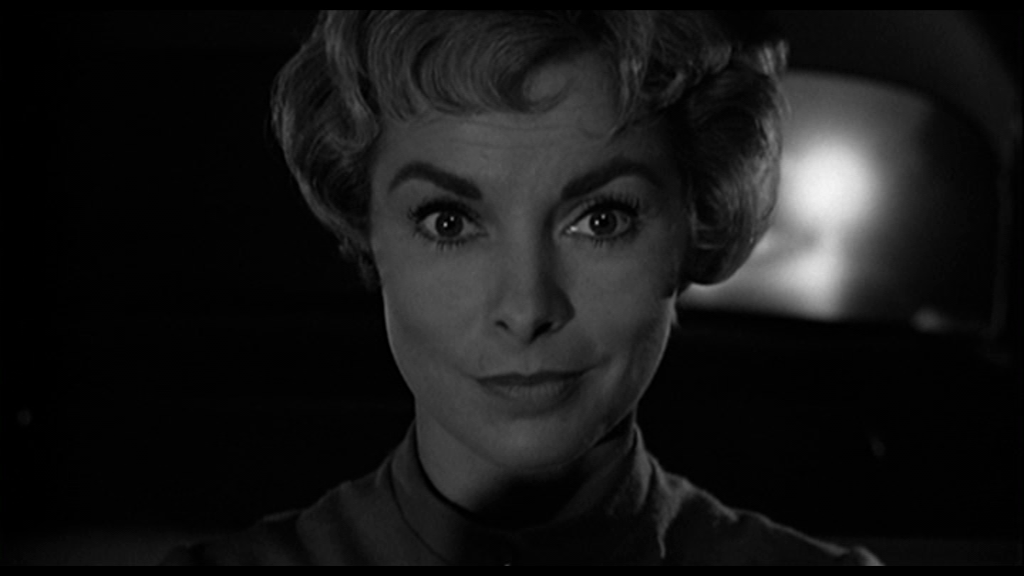 Marion Crane (Janet Leigh) is generally skittish and tense during her impromptu flight with $40,000, and in this scene, as she drives along the highway in the darkness, imagined voice-overs of the people she's running from - police, her employer, her sister - play on the soundtrack. Hitchcock hands the reigns to Leigh, the camera still on her face. Her lips purse, her brow furrows - and then, unexpectedly, her lips curl up into a perverse, proud little smile. Leigh finally gives a possible hint for why Marion's seemingly uncharacteristic move to steal the money might have happened - maybe she just is a little bad.
